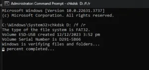 - Run CHKDSK: Type chkdsk D: /f /r