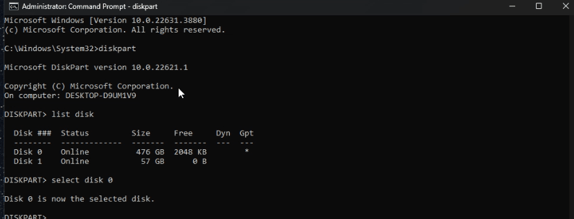 4. A list of disks will be provided. Enter "Select disk X" and Enter.