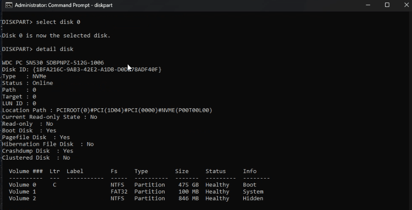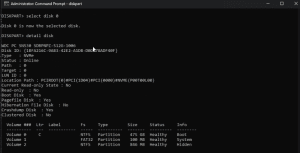 7. Again, select the next disk "select disk x" and Enter. Enter "detail disk" and Enter.