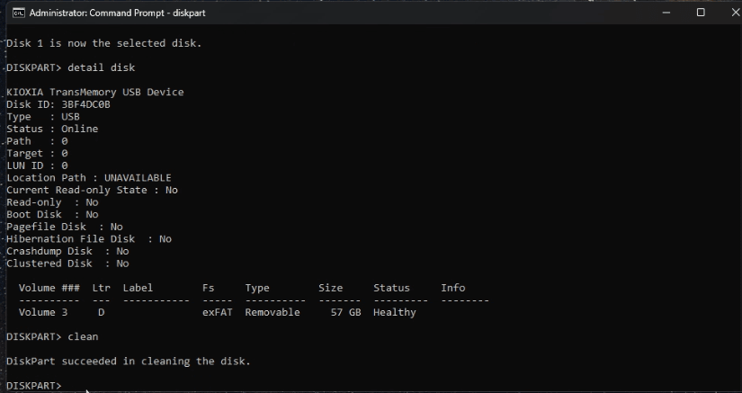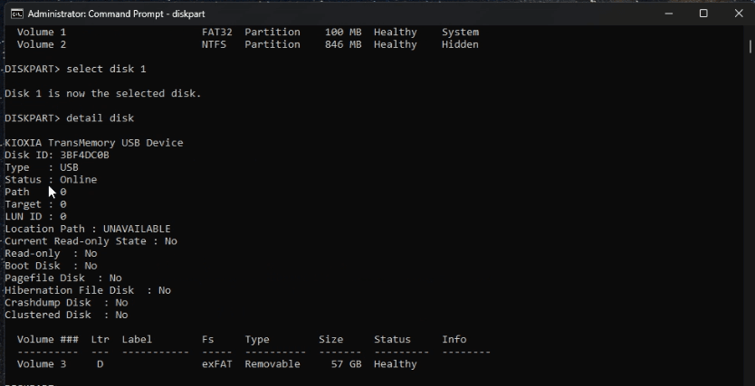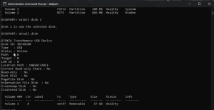 6. Enter "detail disk" and Enter. To check if you have selected the correct pen drive.